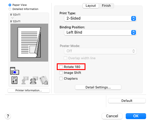 In [Layout / Finish] - [Layout], select the [Rotate 180] check box.