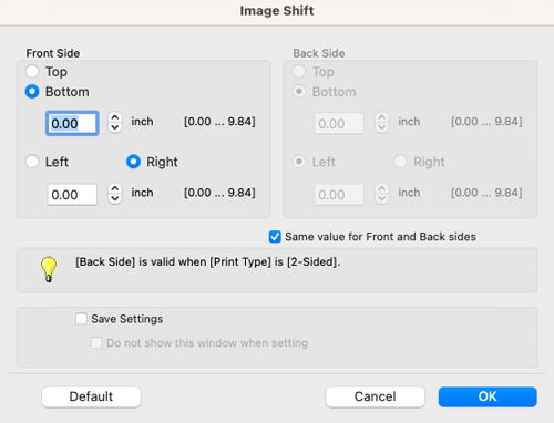 When printing images on both sides, selecting the [Same value for Front and Back sides] check box applies the same settings to both sides.