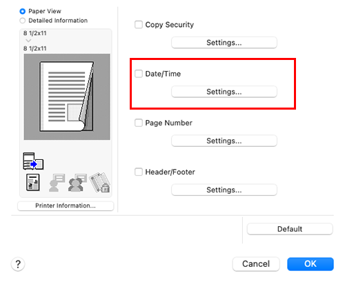 You can add and print the date and time and arbitrary text in the top or bottom margin (header/footer) of the original. You must register the information to be added for the header and footer in advance on this machine. For details on the registration procedure, refer to Registering the Information to be Added to Header/Footer.
