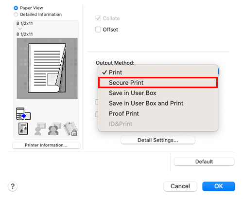 Secure Print is a function that assigns document ID and password to print data and saves the data to the Secure Print User Box of this machine. This function does not print data immediately, thereby preventing printed materials from being missing or left.