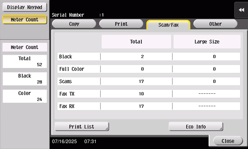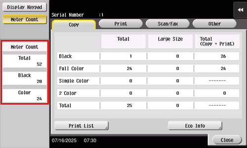 [Color] | Allows you to check the total number of pages printed in Single Color, 2 Color, or Full Color modes. |