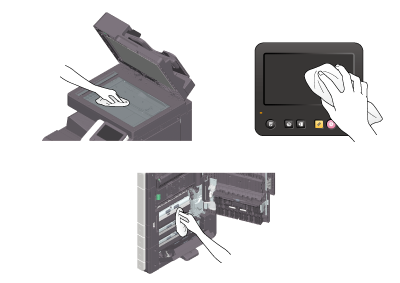 - The inside of this product has areas subject to high temperature, which may cause burns. When checking the inside of the unit for malfunctions such as a paper misfeed, do not touch the locations (around the fusing unit, etc.) which are indicated by a "Caution HOT" caution label. A burn could result.