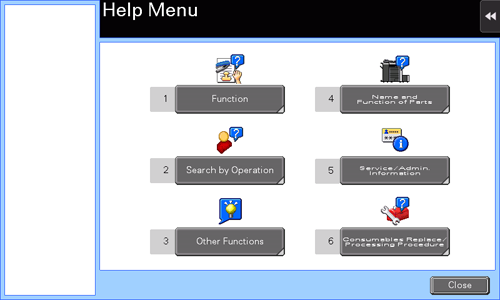When Help Menu (main menu of Help) is displayed, you can search for a target based on an objective or function. The Help Menu consists of the following items. View and check an overview or operation procedure of a specific function.