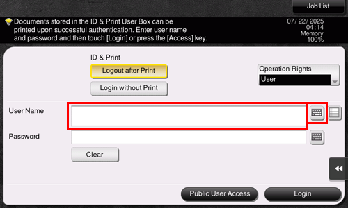 When user authentication is enabled on this machine, the login screen is displayed. Enter the user name and the password, and perform user authentication.