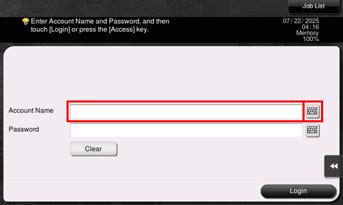 When account track is enabled on this machine, the login screen is displayed. Enter the account name and the password to perform account track.