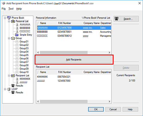 If the recipient is already registered in a group, select the group name, and click [Add Recipients]; all members are added to [Recipient List].