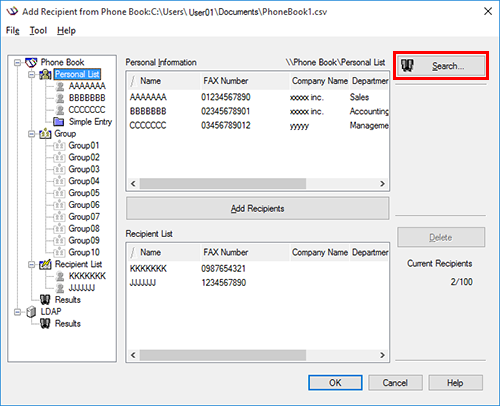 When you search for a recipient, click [Search...] from the Phone Book. Your operations are the same when you open the Phone Book to send a fax and when you open the Phone Book to add a recipient to it.