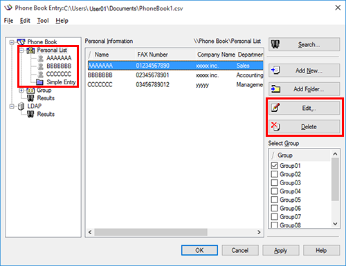 To delete a recipient from the Phone Book, select the recipient from the [Personal List], then click [Delete]. During this time, the recipient is also deleted from the registered group.
