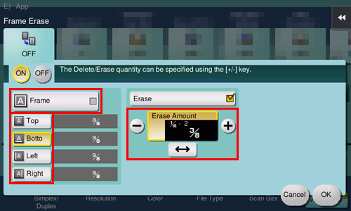Tap [Frame Erase] in [Application] of scan mode of classic style. To erase all of the four sides of the original by the same width, set [Frame] to ON, and specify the width to be erased. To specify the width of the frame to be erased individually, set [Frame] to OFF, select a target side, then specify the width to be erased. When specifying the erase width individually, you can set to exclude a side from erasing by selecting the side and canceling the setting of [Erase] for that side.