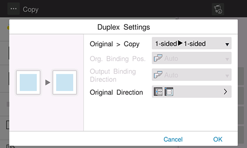 To copy on both sides of paper, select [1-Sided > 2-Sided] in [Original > Copy] of [Duplex Settings], and select the bind position for copying in [Output Binding Direction].