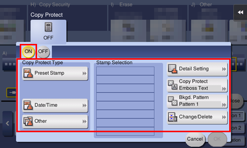To set copy protection, tap [Copy Protect] in [Application] of copy mode of classic style, and set the copy protection type.