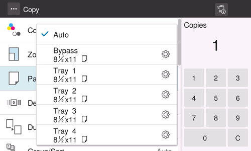 Select [Paper] on the Copy screen, and select the tray loaded with the paper you want to enlarge or reduce.