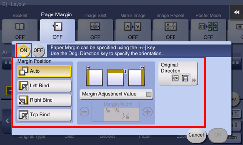 Tap [Page Margin] in [Application] of copy mode of classic style, and set the binding margin. To perform copying on both sides of the sheet, set [Margin Position] and [Original Direction] to ensure that the original is copied in the correct vertical orientation.