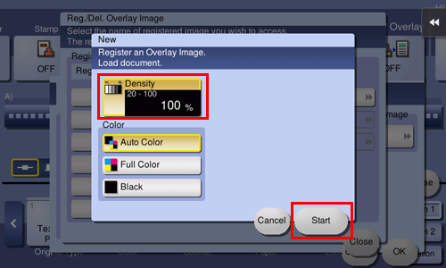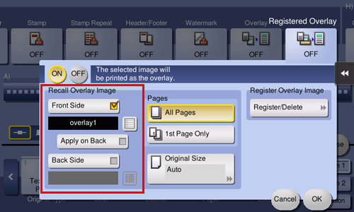 To register the logo or desired image in the storage of this machine, tap [Registered Overlay] in [Application] of copy mode of classic style, and tap [Register/Delete]. Tap [New], enter the overlay image name, then tap [OK]. Load the original containing the overlay image to be registered, change image settings as necessary, then tap [Start]. The original you have set is registered as an overlay image.