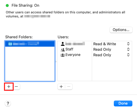 In macOS 11/12, click [Options], and select the [Share files and folders using SMB] check box. Then, select the check box of the login user name (displayed name), and click [Done].