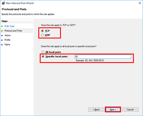Select a protocol, enter the port number in [Specific local ports] and click [Next].