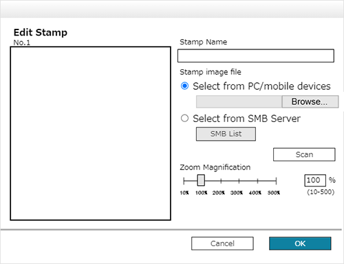 [Zoom Magnification] | Specify the zoom ratio of the stamp image. The ratio can be adjusted in increments of 1%. |