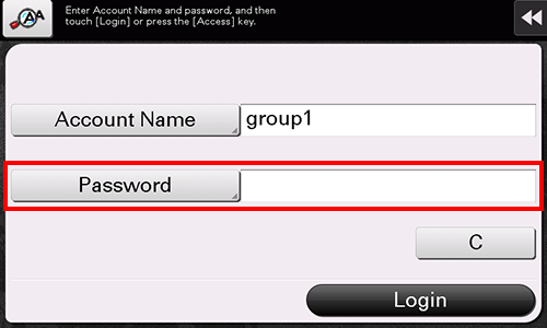 Si está activado el seguimiento de cuentas en la máquina, se visualiza la pantalla de inicio de sesión. Introduzca el nombre de cuenta y la contraseña para habilitar el seguimiento de cuenta.