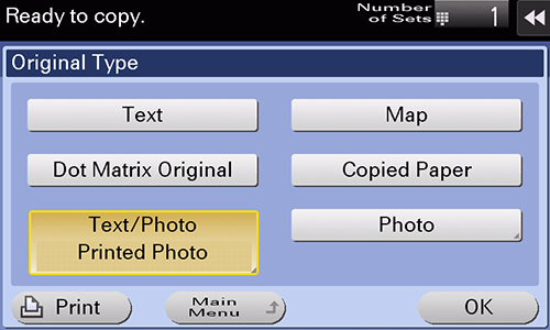[Texto/Foto] | Permite copiar un original que conste de texto y fotos, con la máxima calidad de imagen. Esta función acentúa los bordes de cada carácter y reproduce fotos más suaves.