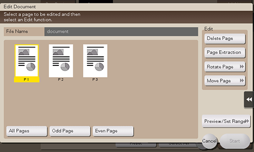 Seleccione un archivo y, a continuación, toque [Otros] - [Editar]. Ahora puede seleccionarse la página del archivo que se debe eliminar o rotar.