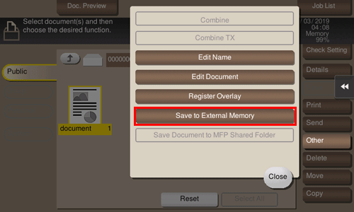 Mientras una memoria USB permanece conectada al puerto USB de esta máquina, seleccione un archivo y toque [Otros] - [Guardar en memoria ext.]. A continuación podrá guardar el archivo en la memoria USB.