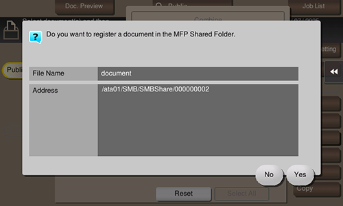 Seleccione un archivo y toque [Otros] - [Guardar doc. en carpeta compartida MFP]. Ahora es posible registrar el archivo seleccionado en la carpeta SMB.