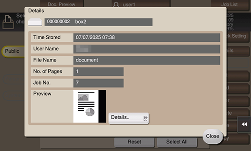 Seleccione un archivo y toque [Detalles doc.] para confirmar la información detallada del archivo.