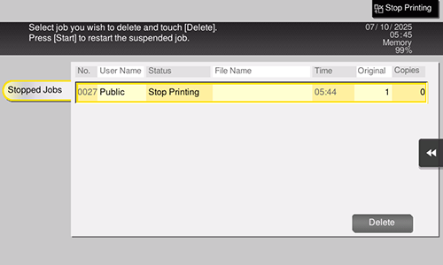 Se muestra una lista con las tareas interrumpidas. Seleccione la tarea en la lista y elimínela.