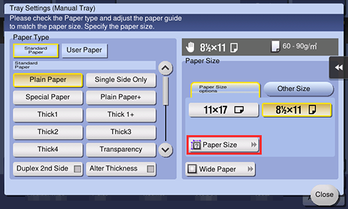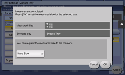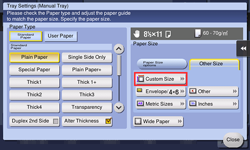 Introduzca el tamaño de papel en [Configuración tamaño personalizado] y cierre la pantalla.
