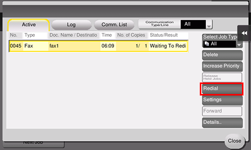 Las tareas pendientes de reenvío se reenvían automáticamente transcurrido un tiempo mediante la función de rellamada automática. Sin embargo, también se puede reenviar el fax manualmente.
