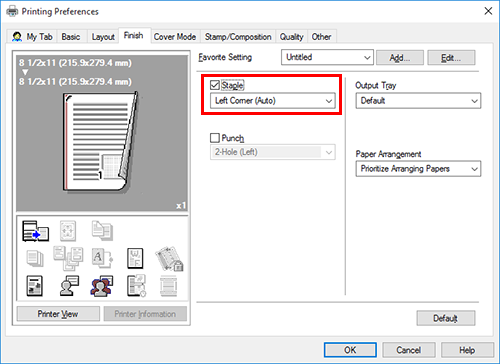 En la pestaña [Finalizar], seleccione la casilla de verificación [Grapar]. Además, especifique el número y las posiciones de las grapas.