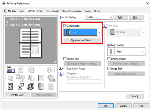 En [Combinación] con la pestaña [Diseño], seleccione "N e N". Por ejemplo, al seleccionar [2 e 2], una página de la imagen de original se amplía, se divide y se imprime en cuatro hojas.