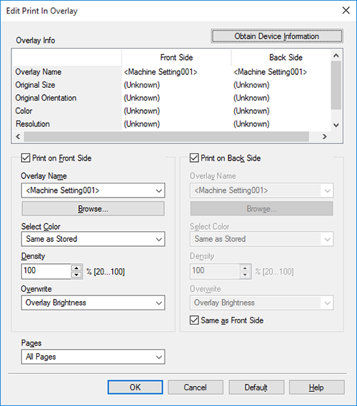 [Impresión en cara frontal]/[Impresión en cara trasera] | Seleccione esta casilla de verificación para componer una imagen de superposición en el lado frontal y en el lado posterior. Además, especifique cómo debe componerse la imagen de superposición. | |