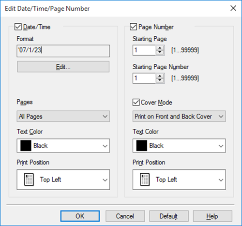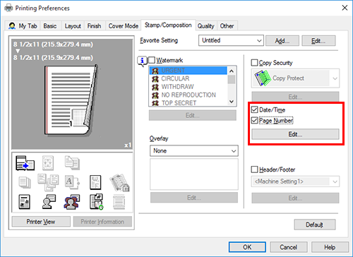 En la pestaña [Sello/Composición], seleccione la casilla de verificación [Fecha/Hora] o [Número de página].