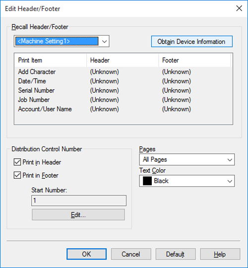 [Recuperar cabecera/pie] | Seleccione el encabezado o pie que se va a recuperar. Si el ordenador es capaz de comunicarse con esta máquina, haciendo clic en [Obtener info dispositivo] se obtiene y se visualiza la información del encabezado/pie más actual registrado en la máquina. |