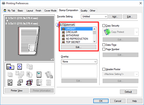 En la pestaña [Sello/Composición], seleccione la casilla de verificación [Marca de agua]. Además, seleccione la marca de agua que desea imprimir.