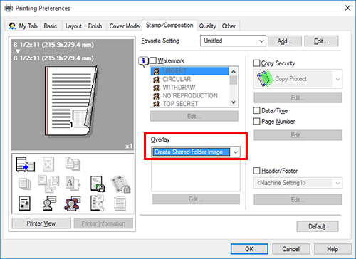 La imagen de superposición se guarda en la carpeta compartida. A partir de ese momento, cuando seleccione [Imprim imag en equipo host] en [Superposición] en la pestaña [Sello/Composición], la superposición guardada aparecerá en la lista y también estará disponible.