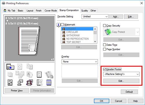 En la pestaña [Sello/Composición], seleccione la casilla de verificación [Cabecera/pie]. Además, seleccione la información que desea añadir al encabezado/pie.
