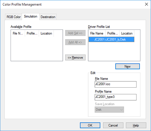 En la lista [Perfil disponible], seleccione el perfil que desea añadir al controlador de impresora y, a continuación, haga clic en [Agr. sel.].