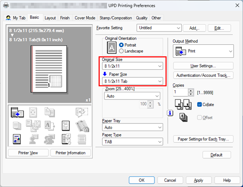 Desde [Tamaño del original] en la pestaña [Básico], seleccione [A4] ([8 1/2x11]), a continuación, seleccione [A4 Tab] ([8 1/2x11 Tab]) desde [Tamaño papel].