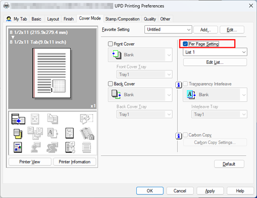 Seleccione la casilla de verificación [Configuración/página] en la pestaña [Modo portada].