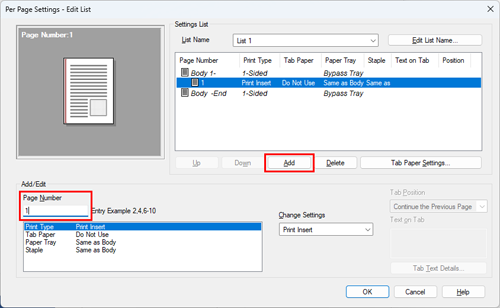 Haga clic en [Agregar] e introduzca [1] en [Número de página].