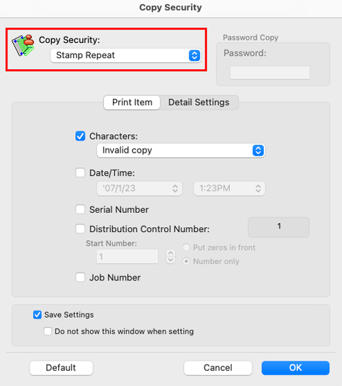 [Número de control de distribución] | Seleccione esta casilla de verificación para imprimir números de copia al imprimir varios juegos de copias. Si es necesario, especifique el formato de los números de copia y de la página desde la que debe comenzar la impresión de números de copia. |