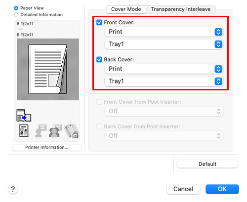 Si es necesario, puede seleccionar si debe imprimirse el original en las hojas insertadas o si estas deben dejarse en blanco. Al imprimir las hojas insertadas, la primera página del original se imprime en la portada frontal y la última página se imprime en la portada posterior.
