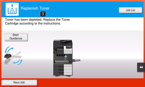 Cuando llega el momento de sustituir un Cartucho de tóner, aparece un mensaje solicitando que se reemplace. Realice la sustitución de acuerdo con el contrato de mantenimiento. Puede tocar [Empezar orientación] para ver y seguir el procedimiento de sustitución en la pantalla.