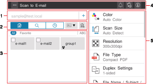 4 | Icono del menú ( | Puede registrar la configuración actual como favorita y recuperarla, o cambiar la forma de mostrar la lista de destinos registrados en el área de especificación de destinos. También puede ordenar los elementos de configuración de opciones para el envío o cambiar la configuración de opciones predeterminada para el envío por la configuración que desee. Para obtener más información, consulte Pantalla de configuración en cada modo. |