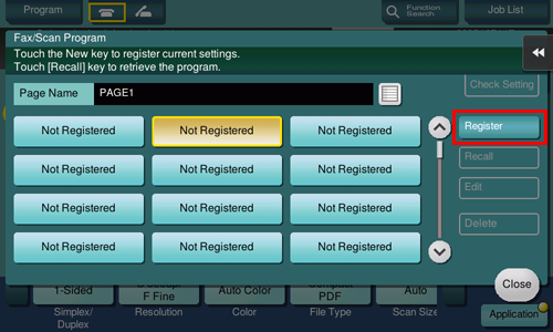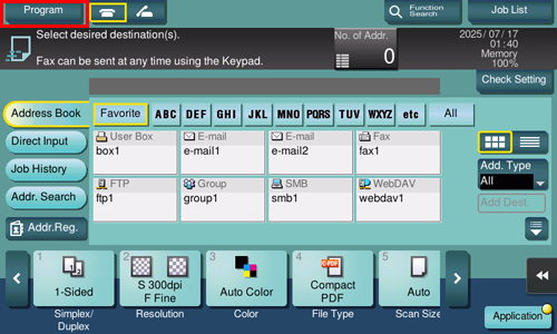 Cuando se registra un programa de escáner/fax, es posible recuperar la combinación de las opciones de configuración desde la pantalla principal con una sola tecla. También puede incluir un destino en el registro del programa.