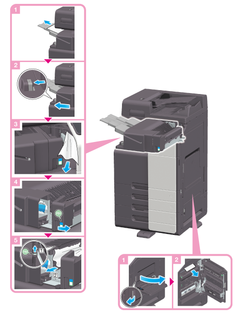 Inicio > Resolución de problemas > Si se produce un atasco de papel o grapas > Si se produce un atasco de papel > Atasco de papel en la Unidad de acabado FS-542