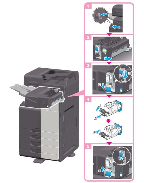 Inicio > Resolución de problemas > Si se produce un atasco de papel o grapas > Si se produce un atasco de grapas > Atasco de grapas en la Unidad de acabado FS-542