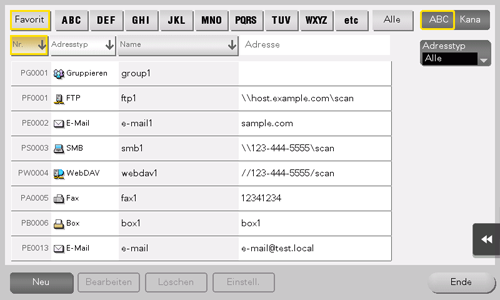 Zum Löschen eines registrierten Ziels wählen Sie seinen registrierten Namen aus und tippen Sie anschließend auf [Löschen].